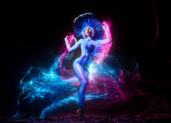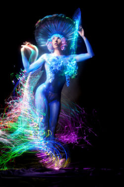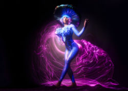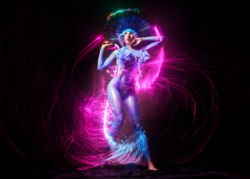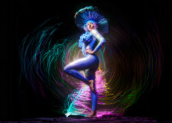 The flow, timing, and posing required for light painting with slow shutter, rear curtain sync is top tier. Claudia had to plan where the LED whip would start, finish and then be frozen in a pose when the rear curtain fired. Absolutely outstanding work by this extraordinary woman.